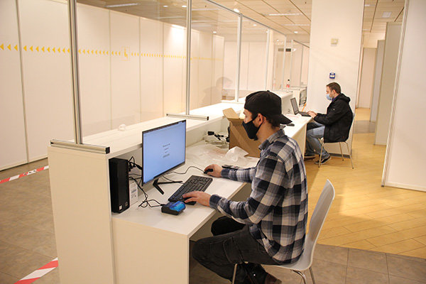 [Marvin Schwarz und sein Kollege von Libertas Expertennetzwerk kümmern sich um die IT-Administration, hier um das digitale Wartesystem.]