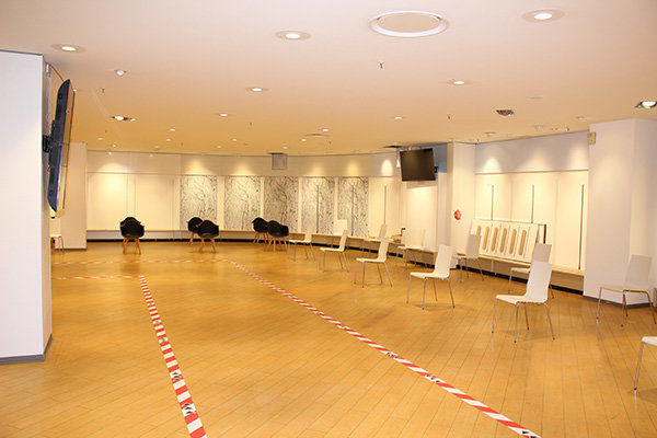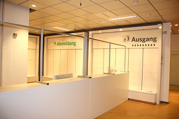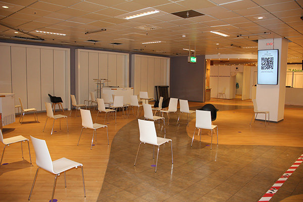 Im geräumigen Wartebereich dürfen die Menschen Platz nehmen, bis ihre Nummer auf den digitalen Anzeigen erscheint.