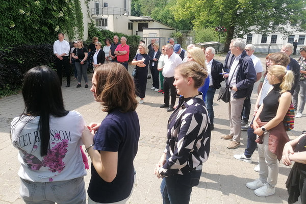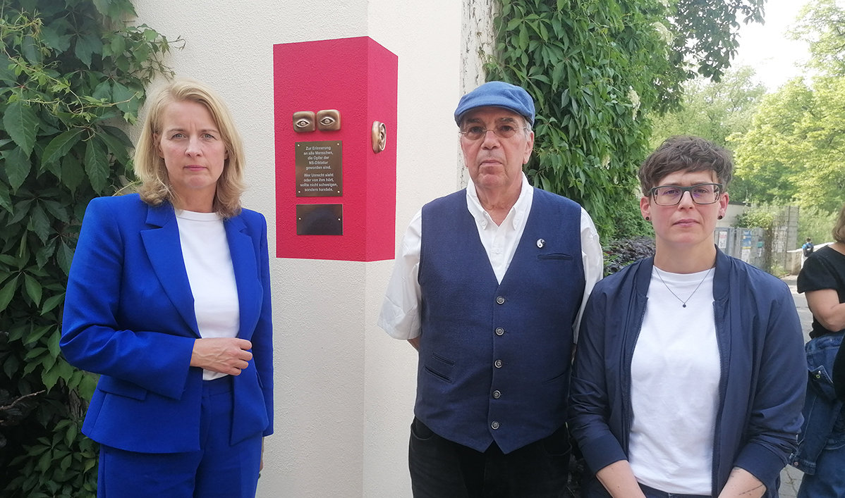 Zahlreiche Menschen waren am Nachmittag zur Enthüllung des Mahnmals auf den Hausmannsplatz gekommen, darunter auch Vertreter aus der Politik und aus den Schulen und dabei insbesondere Teilnehmer der AG „Schule ohne Rassismus – Schule mit Courage“ des Engelbert-von-Berg-Gymnasiums. Für musikalische Beiträge sorgte das Querflöten-Ensemble der Musikschule. Nach der Enthüllung nutzten viele die Gelegenheit, sich direkt vor das Denkmal zu stellen und für einen Moment in die Augen zu blicken. Das dürfte für viele ein Bild gewesen sein, das sie nicht vergessen werden.
