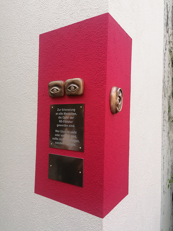 Wenn man über den Hausmannsplatz in Wipperfürth geht, dann dürfte einem dort ein neues Denkmal ins Auge fallen. Recht klein ist es, doch umso größer seine Wirkung. Angebracht wurde es an einer Ecke der Außenseite der Firma Radium. Auf rotem Untergrund, der einem Gesicht gleichkommt, blicken einem zwei bronzene Augen entgegen. Ums Eck prangt ein Ohr. Unter den Augen steht auf einer Inschrift: „Wer Unrecht sieht oder von ihm hört, sollte nicht schweigen, sondern handeln.“ Erinnern soll das Denkmal an die Opfer der nationalsozialistischen Gewaltherrschaft, die es auch in Wipperfürth gab.