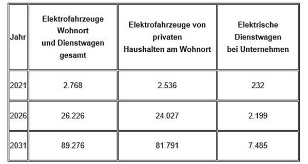Die Zahl von Elektrofahrzeugen wird sich laut Mitteilung im Oberbergischen Kreis zwischen 2021 und 2026 nahezu verzehnfachen. Bis 2030 wird sich die Zahl um den Faktor 32 erhöhen. Bei den Unternehmen wird mit einem Anteil von 75 Prozent die überwiegende Zahl von Elektrofahrzeugen aus dem Bereich der Beschäftigten erwartet.