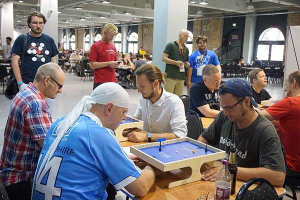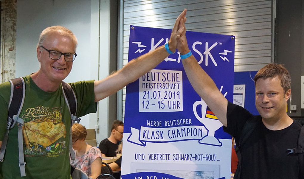 Die Brettspiel-Con in Berlin war Austragungsort der diesjährigen Deutschen Meisterschaft (DM) im Klask. Bei Klask, 2014 von dem Dänen Mikkel Bertelsen erfunden, handelt es sich um ein Geschicklichkeitsspiel für zwei Personen, dass einem Kicker- oder Airhockeyspiel ähnelt. Ziel ist es, eine Spielkugel mit Hilfe von magnetisch gesteuerten Spielfiguren in das gegnerische Tor zu bringen. Um einen Sieg bei der DM einzufahren, musste man mindestens zwei von drei Sätzen für sich entscheiden, wobei ein Satz bis sechs Punkte ausgespielt wurde.