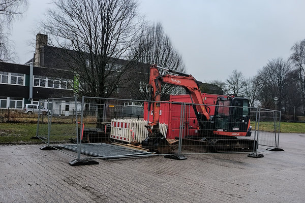 [Auf dem Schulhof steht für den Umbau schon einiges parat.]