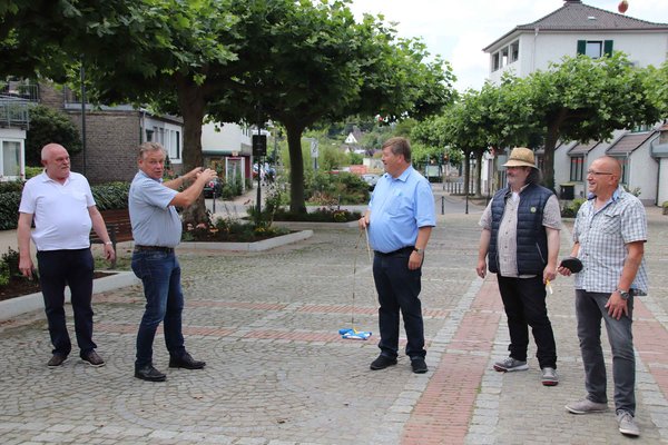 Dort findet jedes Jahr die Sessionseröffnung sowie das Weiberfastnachtsgeschehen statt. Da die Gemeinde Engelskirchen in diesem Frühjahr den Bäumen auf dem Platz eine neue Einfassung zukommen ließ, die erheblichen Platz beansprucht, musste nun direkt vor Ort geschaut und gemessen werden, ob es überhaupt möglich wäre, die Bühne, Ess- und Getränkebuden sowie Toiletten wie jedes Jahr zu platzieren. Beim Messen kam heraus, dass in der Breite nun tatsächlich zweieinhalb Meter fehlen, was die gewohnte Aufstellung unmöglich macht. Nach einigen Überlegungen teilte Armin Gries mit: „Dann müssen wir eben alles um 180 Grad drehen und die Bühne steht gegenüber der alten Stelle, so passt es wieder.“ „Wir versuchen das Beste daraus zu machen“, ergänzte Reinhold Müller. „