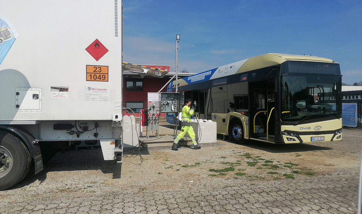 Stationiert sind die Busse auf dem Betriebshof in Wipperfürth-Hämmern. Betankt werden die Busse in der Anfangszeit über eine mobile Tankstelle von Air Liquide, einem französischen Hersteller für Gase. Hierfür wird der Wasserstoff in Trailern angeliefert und über eine Umfülltafel direkt aus dem Trailer in den Bus gefüllt. Daniel Schäfer, der bei der OVAG vor etwa vier Jahren als Projektleiter eingestellt worden ist, laut Corinna Güllner „unser Mann für Wasserstoff“ sei, demonstrierte den Tankvorgang. 15 Minuten werden zum Volltanken benötigt. 15 Fahrzeuge sollen täglich betankt werden – heißt: pro Tag werde ein neuer Trailer benötigt.