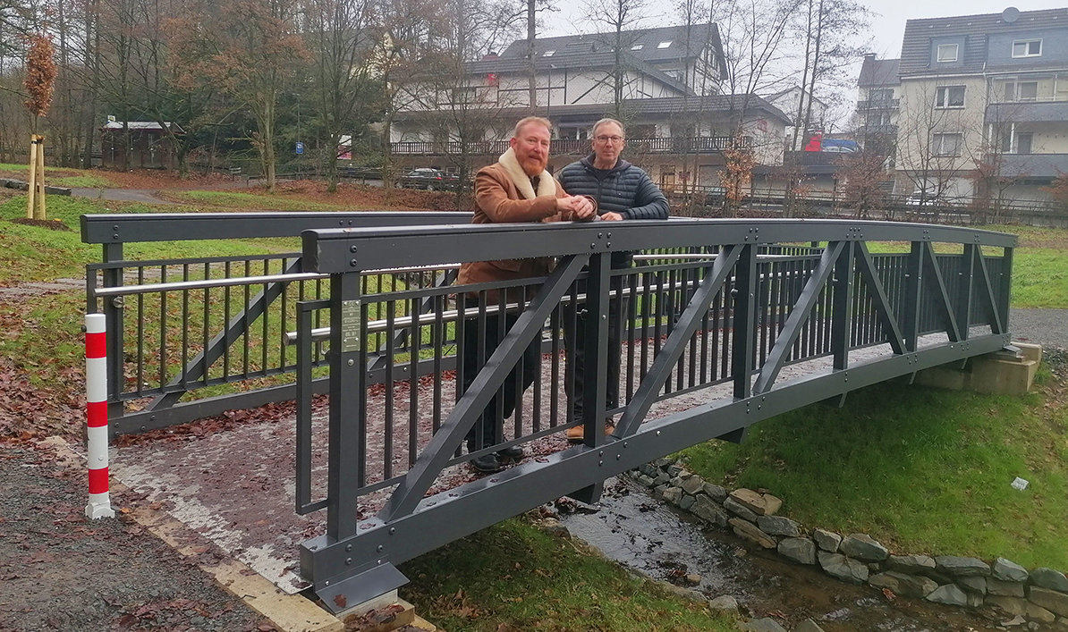 Mittlerweile ist der Bereich an der Hülsenbuscher Straße völlig verändert. Von dem einst künstlich angelegten Teich ist nichts mehr zu sehen, stattdessen schlängelt sich dort wieder der Hömicker Bach entlang. Und anstelle des Damms, über den ein Gehweg führte, gibt es dort nun eine kleine Brücke für Fußgänger. Bei einem Termin vor Ort mit OA erklärten Jürgen Hefner, Erster und Technischer Beigeordneter der Stadt Gummersbach, sowie Marc Böhnke, Leiter des Gebäudemanagements der Stadt, was auf dem Areal schon realisiert worden ist und was noch gemacht werden muss.