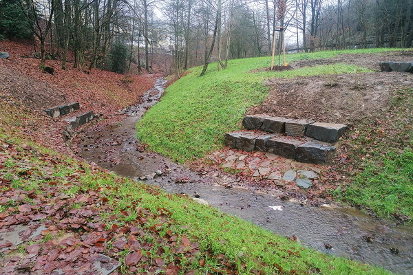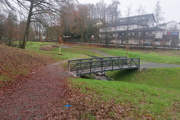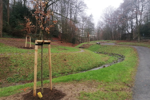 [Entlang des Baches wurden einige Bäume gepflanzt. Handläufe sollen erst im neuen Jahr angebracht werden.]