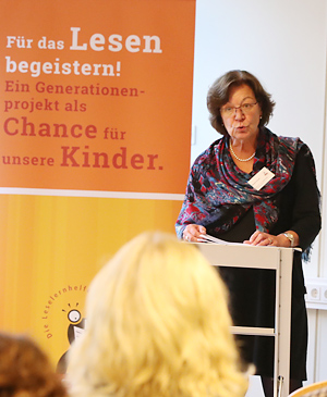 Margaret Schaaf, 1. Vorsitzende des Bundesverbandes, erläuterte die Mentor-Idee. Sie zeigte die Dringlichkeit der Leseförderung auf. Ohne die Basiskompetenz Lesen sei eine Teilhabe am gesellschaftlichen Leben kaum möglich. Lesen können stärke das Selbstbewusstsein, unterstütze die Integration und steigere die Lust am Lernen. Sie erzählte von den Erfolgen erfahrener Leselernhelfer, die, bei den ihnen anvertrauten Kindern, mittels emotionaler Unterstützung die Freude am Lernen gesteigert hätten. Auch die Mentoren nähmen viel aus ihrer Arbeit mit.