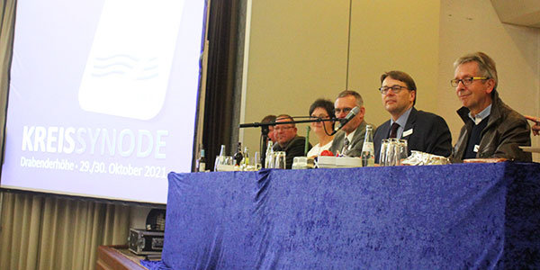 [Michael Braun (2.v.r.) freute sich, seit seinem Antritt als Superintendent im Februar 2020 zum ersten Mal eine Synode in Präsenz leiten zu dürfen.]