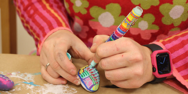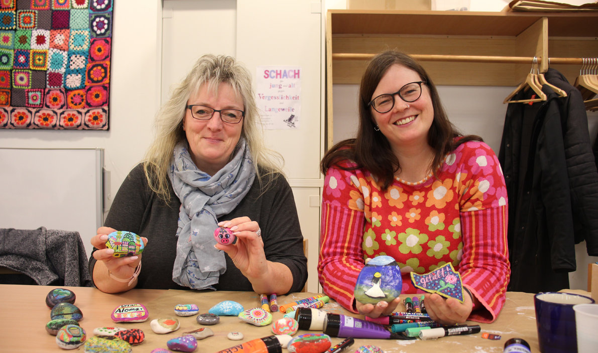 Auch im Ankommens- und Begegnungstreff am Bismarckplatz, angeboten von der Stadt Gummersbach, werden seit Oktober fast jeden Dienstag von 14 bis 16 Uhr mit den Besuchern Steine bemalt. Die Idee eingebracht hatte Miriam Neufurth, die zusammen mit Barbara Reuter das kreative Angebot betreut. Anfangs wurde vor allem gehäkelt. „Für mich selbst habe ich schon seit mehreren Jahren Steine bemalt. Als ich dann von der Facebook-Gruppe gefragt wurde, ob ich diese nicht auch mal auslegen möchte, war ich sofort im Fieber drin. Und dann kam mir die Idee, auch im Begegnungstreff Steine zu bemalen“, sagt Neufurth, die auch Leiterin der Suppenküche in Steinenbrück ist. Mit großem Erfolg: Der Treff war rappelvoll zu Beginn des Angebots, inzwischen kommen bis zu zehn Menschen, Einheimische und Geflüchtete, um gemeinsam kreativ zu sein.