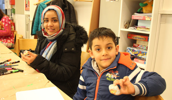 [Der sechsjährige Iman malt zusammen mit seiner Mutter Afsaneh Amini Steine an. Sie kommen häufiger in den Begegnungstreff in Gummersbach.]