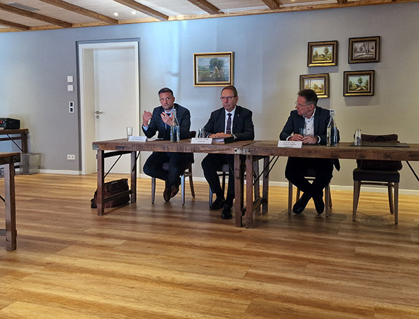 [Sascha Klein (Geschäftsführer Klinikum Oberberg, v.l.), Jochen Hagt (Landrat OBK) und Prof. Dr. Norbert Roeder stellten im Rahmen einer Pressekonferenz die Zukunftspläne vor.]
