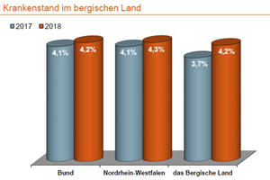 Der Krankenstand im Bergischen Land sei 2018 insgesamt deutlich gestiegen, so Brelöhr. Die Ausfalltage aufgrund von Erkrankungen lagen 0,5 Prozentpunkte über dem Vorjahresergebnis. Trotzdem liegt das Bergische mit einem Schnitt von 4,2 Prozent noch knapp unter dem Landesdurchschnitt (4,3). Damit seien an jedem Tag des Jahres von 1.000 Arbeitnehmern 42 krankgeschrieben gewesen.