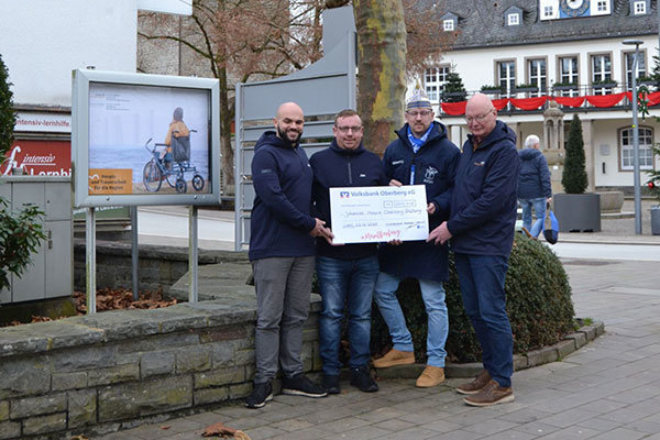 [Foto: Hospizstiftung/Sabine Eisenhauer --- Den Spendenscheck überreichten vor dem Büro der Stiftung in Wiehl (v.li.) Alexander Otte, Jan Karrasch und Yannik Müller vom KVB an den ehrenamtlichen Stiftungsmitarbeiter Michael Adomaitis.]