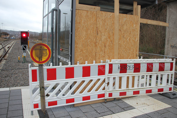 Ein kurzer Rückblick: Im Juni 2018 begann die Deutsche Bahn damit, den Bahnhof Dieringhausen umzubauen, „mobilitätsgerecht“, wie sie auf Nachfrage mitteilte. Unter anderem wurde der Bahnsteig auf 170 Metern Länge und einer Höhe von 76 Zentimetern über Schienenoberkante neu gebaut sowie mit einem Blindenleitsystem ausgestattet. Die Einfassung der Stützenfüße des Bahnsteigdaches wurde angepasst und der Gepäckaufzug zurückgebaut. Diese Arbeiten wurden bis zum Fahrplanwechsel im Dezember 2018 beendet. Was noch fehlte, war die Fertigstellung des neuen Personenaufzugs.
