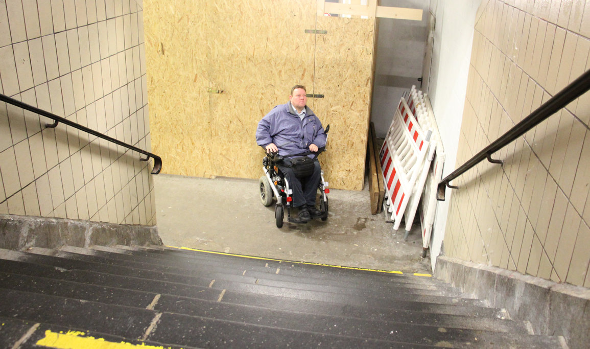 Achim Roth fährt mit seinem elektronischen Rollstuhl die Rampe zum Haupteingang des Bahnhofs Dieringhausen hinauf. Mit Übung kommt er durch die schweren Türen hindurch und rollt weiter Richtung Gleise. Vor der langen Treppe, die zum Bahnsteig führt, bleibt er stehen. Hier ist für ihn Endstation. Denn ohne Aufzug hat er keine Chance, mit seinem 80 Kilo schweren Rollstuhl die Stufen zu erklimmen. Dass ihn freundliche Helfer hochtragen, scheidet ebenso aus. Er fragt: „Wann wird der Bahnhof endlich wirklich barrierefrei?“ Denn der Einbau des Aufzugs wurde von der Deutschen Bahn bereits begonnen. Die Arbeiten stehen aber seit geraumer Zeit still.