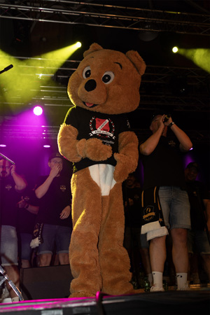 Für einen wahren Gänsehautmoment sorgte der Rapper „Tatwaffe“, der beim Gastauftritt mit seinem Hit „Die Eine“ gemeinsam mit dem Chor performte. 1.000 Euro gingen an seine Hip-Hop-Formation „Die Firma“, die sich für soziale Projekte einsetzt. Die gleiche Summe bekam das Jugendzentrum „Glashütte“ in Köln. Auf der Bühne feierte zwischenzeitlich auch der „Klaswippbär“ (Foto rechts), Maskottchen des Sportvereins aus dem Wipperfürther Ortsteil, beim Lied „Leev Marie“ von den Paveiern eine rauschende Party.