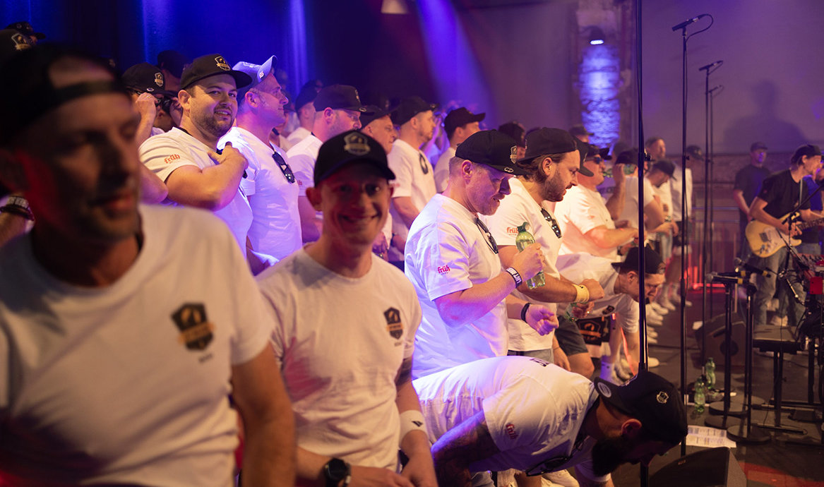 Sie werden in der Region immer bekannter, sie sorgen bei ihren Auftritten für beste Stimmung: Der Männerchor „Laut aber Schief“ aus Overath-Marialinden begeisterte am Freitagabend das Publikum in der ausverkauften Gummersbacher Halle 32 restlos. Dabei sorgten die über 100 Sänger auf der Bühne für einige stimmungsvolle Highlights. Der Spaß steht bei den Aktiven im Vordergrund, trotzdem lieferten sie mit einer durchweg choreografierten Licht- und Tonshow einen hochprofessionell wirkenden Auftritt ab und brachten die Zuschauer schnell in Stimmung.