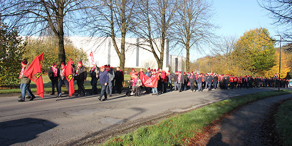 Um 9:25 Uhr hatte sich der Tross der Beschäftigten vom Werkstor 2 der Firma Rüggeberg lautstark und unter Polizeibegleitung in Bewegung gesetzt. Auf der Straße Am Krüenberg marschierten sie rund 500 Meter die Straße runter und wieder hoch, bevor es vor MAT zu einer kurzen Kundgebung kam.