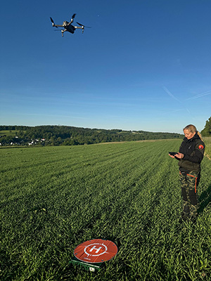 Zogen sie früher in Menschenketten durch die Wiesen, um Kitze und andere Tiere zu suchen, laufen die Einsätze mit moderner Technik heute etwas anders ab. Früh morgens, lange vor dem Sonnenaufgang, lassen die Ehrenamtlichen eine Drohne samt Wärmebildkamera über ihren jeweiligen Einsatzort fliegen und machen sich dabei auch Geodaten zunutze. Durch Wärmepunkte sehen die Ehrenamtlichen dann, wo sich Tiere aufhalten könnten. „Dabei haben wir schon so oft erlebt, dass wir die Tiere ohne Drohne gar nicht gefunden hätten“, schilderte Adolphs.