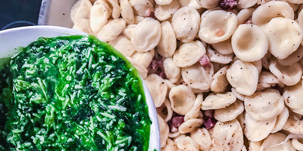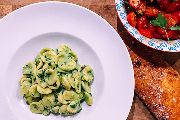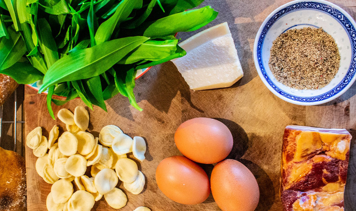 Orecchiette ‚Bärlauch-Carbonara‘ (für zwei Personen), dazu passt Tomatensalat, gegrilltes Gemüse, Ciabatta oder auch Blattsalate