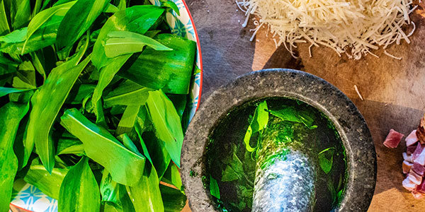 Den schwarzen Pfeffer fein mörsern und bei Seite stellen. Anschließend den gewaschenen Bärlauch ebenfalls fein mörsern.