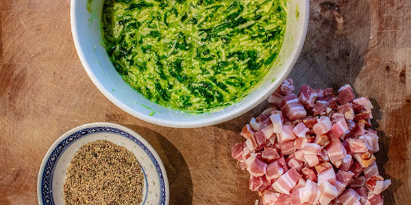 Den Pecorino reiben und mit den Eiern und dem gemörserten Bärlauch zusammen verquirlen.