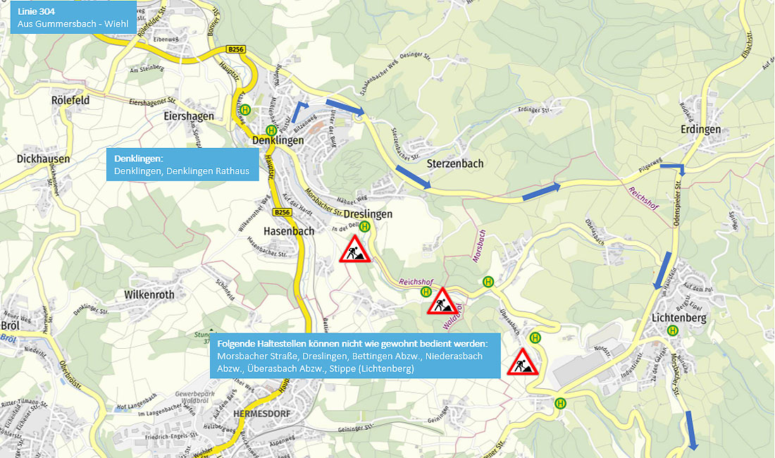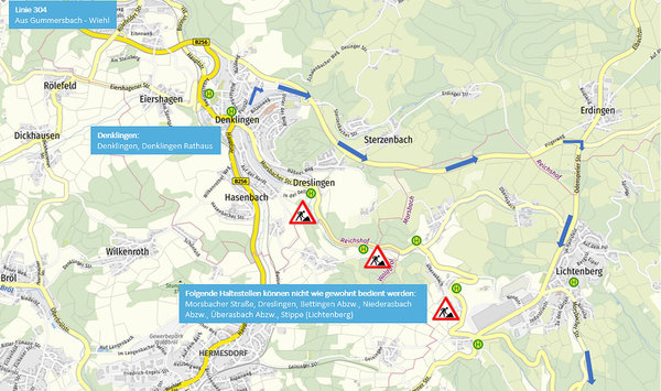 Die Linienfahrten der 304 in Richtung Morsbach werden ab der Haltestelle Denklingen Rathaus über die Poststraße und die L 344 ohne Zwischenhalt nach Morsbach-Lichtenberg umgeleitet. Daher können die Haltestellen Denklingen (Morsbacher Straße), Dreslingen, Bettingen Abzw., Niederasbach Abzw., Überasbach Abzw. und Lichtenberg-Stippe mit dem regulären Linienverkehr nicht bedient werden. In Richtung Gummersbach gilt die Umleitung entsprechend in die entgegengesetzte Richtung.
