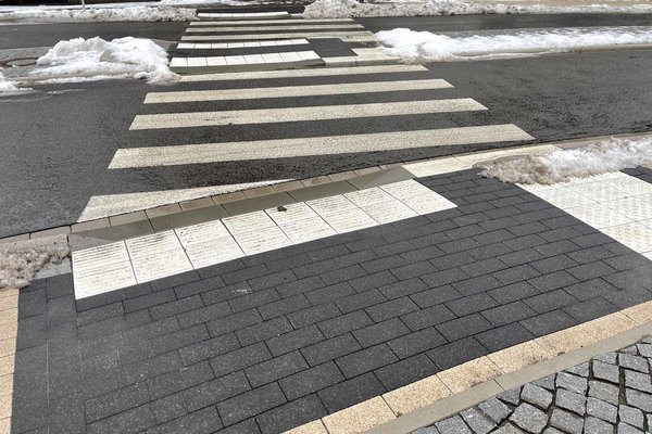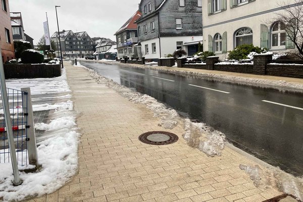 Der an den Platz angrenzende Bürgersteig ist deutlich breiter angelegt worden. „Die Begrenzung zum Heier Platz ist noch provisorisch“, räumt Meisenberg ein. Man hält sich alle Optionen für ein Angleichen des Niveaus zwischen Platz und Bürgersteig offen (Foto), je nachdem, wie der zentrale Ortstreffpunkt schließlich gestaltet wird. Der Zebrastreifen mit sehbehindertengerechten Bordsteinkanten schließt sich an die gegenüberliegende, sanierte Fahrbahn der Leppestraße an.