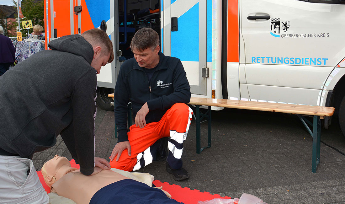 Mut zur Herzdruckmassage haben der Rettungsdienst des Oberbergischen Kreises und Mitarbeiter der Intensivstation des Kreiskrankenhauses Waldbröl auf dem Vieh- und Krammarkt in Waldbröl gemacht. Vom Schüler bis zum Rentner herrschte reges Interesse an den kurzen Schulungen der Retter, heißt es in einer Mitteilung des Klinikums Oberberg.