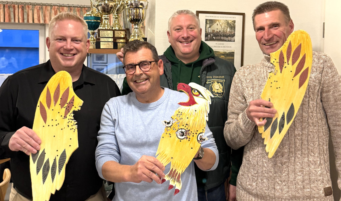 Mit dem amtierenden Schützenkönig startete der Wettkampf. Die kleine Krone des hölzernen Vogels ist als Trophäe unter Schützen besonders begehrt. Andreas Loser war der glückliche Schütze. Nach hartem Kampf gelang es dann auch Patrick Brocks, mit dem 179. Schuss den linken Flügel von der Stange zu holen. Michael Wolf (Schützenkönig 2012) hielt das Tempo mit und ließ mit dem 248. Schuss den rechten Flügel krachend zu Boden fliegen. Nachdem nun die Pfänder vergeben waren, entbrannte der Kampf um den Vogel. In einem spannenden Kampf wehrte sich das hölzerne Federvieh hartnäckiger als gedacht. Erst mit dem 312. Schuss gelang dann Markus Günther (Schützenkönig 2016) der Meisterschuss, der ihn für ein Jahr zum „König der Könige“ des Schützenvereins Lindlar und zum Gewinner des „Bruno-Hamm-Pokals“ macht.