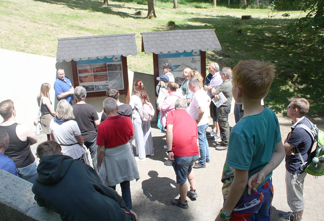 Als eines von allein fünf Duos, die Führungen durch den Wiehltalsperren-Damm leiteten, empfingen der stellvertretende Talsperren-Meister Alfred Schwarzer und Kollege Matthias Mauelshagen eine der Besuchergruppen am Fuß des „Tosbeckens“, dem Überlauf der Sperre. Ausgerüstet mit wissenswerten Infos und spannenden Details zum 360 Meter langen Steinschüttdamm, dessen Errichtung sowie engmaschige technische und bauliche Kontrolle und Bewuchs-Pflege, tauchten die Besucher über einen 90 Meter langen Tunnel ein ins unterirdische Reich der Wiehltalsperre. Entlang der Herdmauer führt eine Treppe mit 287 Stufen wieder hinauf auf die Staumauer, wo die angestrengte Gruppe mit einem überwältigend schönen Blick über die idyllische Talsperre belohnt wurde.