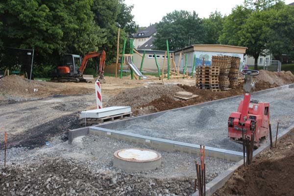 Gerade hier zeigt sich die Bürgerbeteiligung gut. Die Kinder durften nämlich zu einem gewichtigen Teil mitentscheiden, wie ihr Schulhof denn später aussehen soll. Sie haben sich für das Thema Natur und Zoo entschieden, was sich in Spielgeräten und der farblichen Gestaltung niederschlagen wird. Ganz neu wird sein, dass sich der Schulhof auf mehrere Ebenen aufteilt. Auch ein „grünes Klassenzimmer“ draußen ist schon zu erkennen. Die Bauarbeiten sind schon in vollem Gange. Um den Jahreswechsel herum soll alles fertig sein.