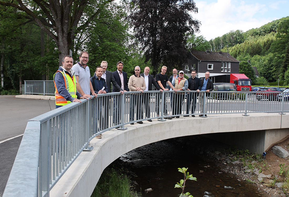 Dass eine Brückenkonstruktion mehr ist als nur ein bisschen Teer und eine Stahlkonstruktion über ein fließendes Gewässer, darüber hatte sich Bürgermeister Thul im Vorfeld der Einweihung genauestens informiert: „Das ist ein hochkomplexes Verfahren und muss von langer Hand geplant werden.“ Beteiligt hieran waren neben der Stadt Bergneustadt, auch der Aggerverband, das Ingenieurbüro Donner und Marenbach sowie die Firma Klaus Hombach Hoch- und Tiefbau. Bevor der erste Spatenstich für die nun doppelt so breite Brücke gesetzt werden konnte, mussten zunächst einmal Gas- und Stromleitungen verlegt werden.