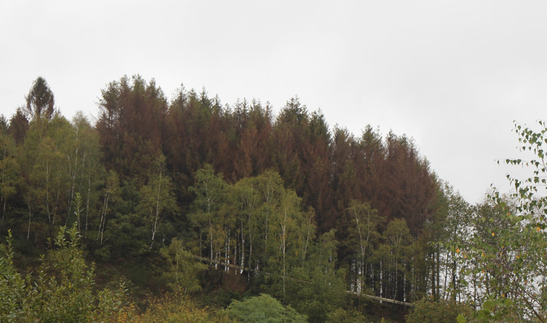Wer derzeit im südlichen Bergischen Land in die Landschaft schaut, für den sind die Folgen unübersehbar. Ganze Berghänge und Kuppen zeigen die gelbe und rote Farbe toter Fichtennadeln. Aus Laubwäldern ragen die vertrockneten Kronen der Buchen. Auf die Ursache dieser Entwicklung, die unmittelbaren Folgen und die zukünftigen Maßnahmen sind bei einer Pressekonferenz im Lindlarer Metabolon Kay Boenig, Leiter des Regionalforstamts Bergisches Land, und Hans-Friedrich Hardt, Vorstandsmitglied beim Waldbauernverband NRW, eingegangen. „Viele Menschen sind verunsichert. Es ist ein Thema, das alle angeht“, so Boenig.