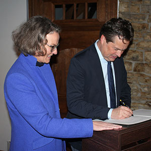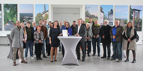 [So sieht Freude aus: Bürgermeisterin Larissa Weber (Mitte, v.l.) mit Ministerin Ina Scharrenbach und dem Landtagsabgeordneten Bodo Löttgen sowie Stadtverordneten, engagierten Jugendlichen, Vetretern der Bürgergemeinschaft Eichen und der Verwaltungsspitze.]