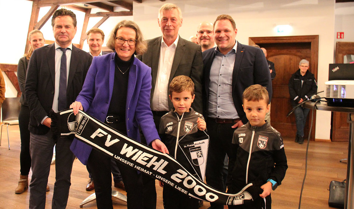 Stolze 1,22 Millionen Euro übergab Scharrenbach im Bielsteiner Burghaus für den geplanten zweiteiligen Tribünenanbau in der Walter-Lück-Sportanlage. Das Gelände ist im Eigentum der Stadt, der FV Wiehl ist Pächter. Die Stadt wird noch 136.000 Euro selbst übernehmen. Die Anbauten sollen ein lang diskutiertes Problem des FV Wiehl endlich lösen und ein neues Vereinsheim beherbergen. Das alte ist schon lange teilweise gesperrt, weil es Probleme mit einer der Bodenplatten gibt und sich ein Teil des Gebäudes absenkt. Mehrere Anläufe unternahm die Stadt, eine Förderung für die Pläne des Vereins zu bekommen. Zwischenzeitlich war die Stimmung zwischen den Beteiligten angespannt. Doch kurz, bevor ein Plan B greifen sollte, kam doch noch die frohe Kunde aus Düsseldorf.