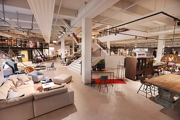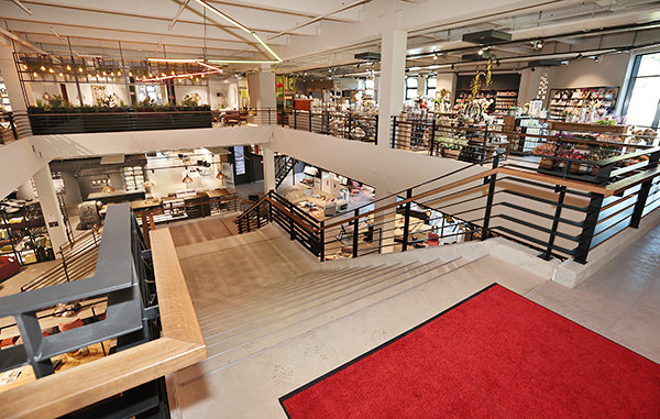 Optisches Highlight im Inneren ist neben den vielen Kollektionen die große eingezogene Treppe, die die beiden Ebenen miteinander verbindet. Die zahlreichen eingebauten Fenster und das bunte LED-Licht im Eingangsbereich sorgen für ein tageslichtdurchflutetes Ambiente. Aus den vielen Eingängen von früher wurde ein einziger: Künftig können die Kunden jederzeit trockenen Fußes aus dem großen Parkhaus auf der ersten Ebene in das Möbelhaus gelangen.