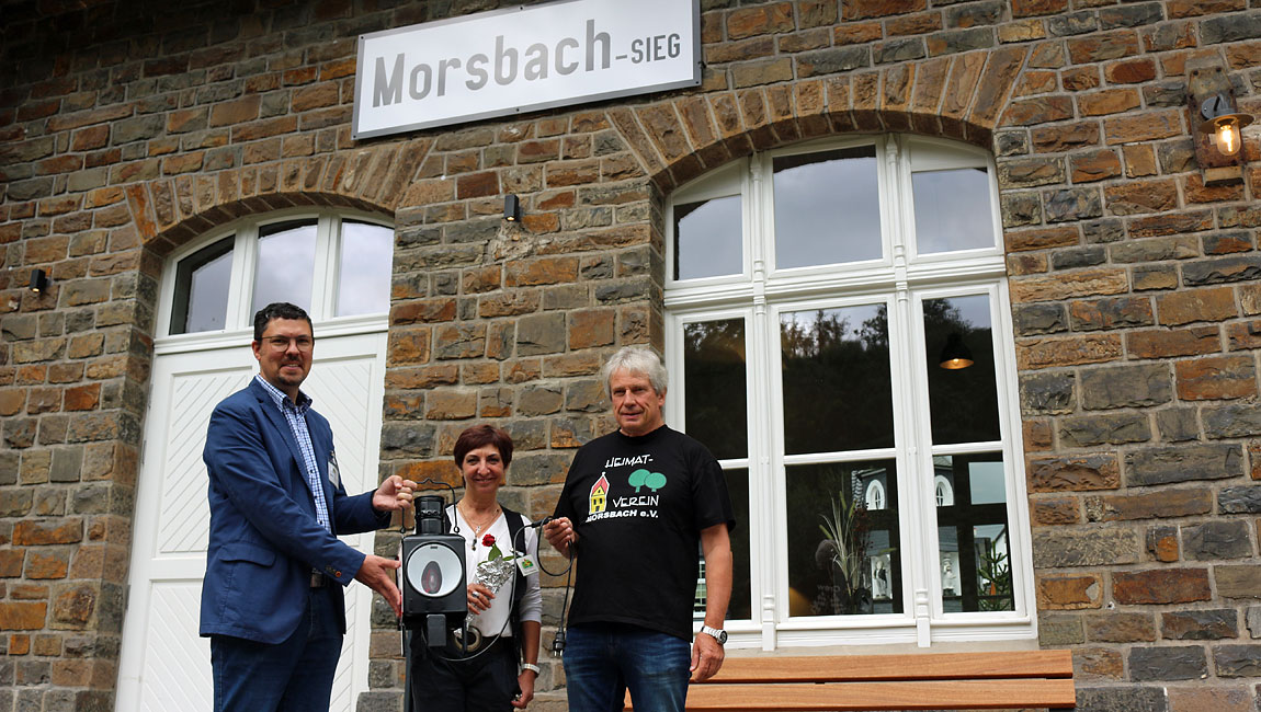 Die beiden Schilder ließ der Heimatverein nach den alten Originalvorlagen und mit der historischen Bahnhofs-Einheitsschrift neu anfertigen. Werner Schuh, Vorstandsvorsitzender des Heimatvereins, überreichte Bürgermeister Jörg Bukowski und Objektmanagerin Nadja Schwendemann eine Schlussleuchte, die das Ende des Bahnhofumbaus symbolisiert. „Eine großartige Idee“, fand Morsbachs Bürgermeister Jörg Bukowski. Für das leibliche Wohl sorgte der Heimatverein mit gegrillten Würstchen und die Weitblickinitiative mit Kaffee und Kuchen.