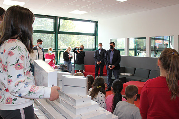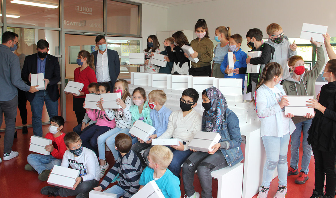 Bürgermeister Frank Helmenstein freute sich, das Projekt zu starten. Für ihn ganz wichtig: Wenn die Stadt die Schüler mit technischen Endgeräten ausstattet, ist gesichert, dass jedes Kind und jeder Jugendliche unabhängig vom Bildungsstand und seiner privaten Lebenssituation versorgt ist. Dies schaffe Teilhabe und Bildungsgerechtigkeit. Die Tablets stehen kostenfrei hauptsächlich für die Nutzung im Unterricht zur Verfügung. Jannik Kleine, Medienkoordinator der Schule erklärte, dass die Schule durch das digitale Managementsystem „Jamf School“ alle Tablets verwalten und somit die Funktionen während der Schulzeit limitieren kann. Durch ein privates Profil ist allerdings Zuhause eine uneingeschränkte, freie Verwendung der Geräte möglich.