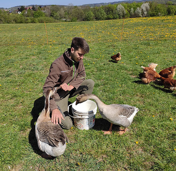 Die insgesamt 250 Lohmann-Hennen legen am Tag 220 Eier. „80 Prozent vermarkte ich im Moment im eigenen Eierhäuschen und 20 Prozent gehen zum einen ins Lichtenberger Lädchen und zum anderen in eine Kölner Metzgerei“. Doch die Lichtenberger Hühner-Gang braucht auch Schutz. Als zuverlässige „Aufpasser“ fungieren die Gans „Gundel“ und der Ganter „Gustav“.