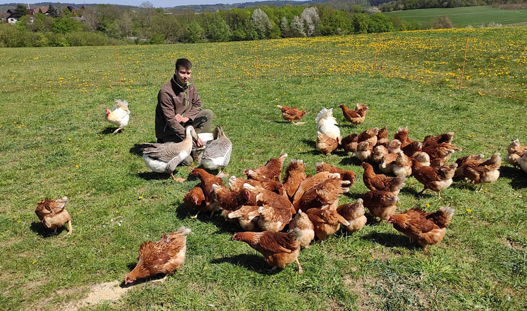 Aber zurück zu den Hühnern. Das Hühnermobil ist voll gepackt mit moderner Technik. Solaranlagen versorgen es mit Strom, Klappen für den Auslauf öffnen sich automatisch, ebenso wie sich der Wasser- und Futtervorrat automatisch regulieren lässt. Es bietet den 225 Biolegehennen und fünf Hähnen ausreichend Platz. Nachts schlafen die Hühner oben auf der Stange, morgens flattern sie einen Stock tiefer und legen ihre Eier in die mit Dinkelspelzen ausgelegten Nester, und tagsüber picken sie im Freien. Alle zwei Wochen wird der Trecker angekuppelt und schleppt den Stall samt Tieren auf eine frische Wiese. „Durch die geringe Standzeit des Hühnermobils sinkt der Infektionsdruck, wodurch die Gesundheit der Tiere gefördert wird“, erklärt der Jungbauer. Der Hühnermist trägt zu einem guten Nährstoffkreislauf bei und bringt wichtige Nährstoffe in den Boden zurück, die in der biologischen Landwirtschaft unverzichtbar sind.