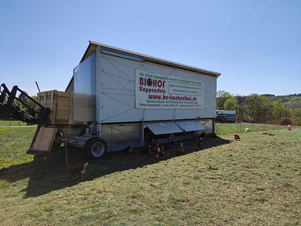 Die Corona-Pandemie hat viele Menschen verunsichert, Existenzen standen und stehen auf dem Spiel, der Bewegungsspielraum war eingeengt. Letzteres sorgte aber auch dafür, dass gerade Lebensmittel-Produkte aus der Region mehr gefragt waren. Dort kann Niklas Kappenstein ein gewichtiges Wort mitreden. Schließlich hat der Biobauer vor zweieinhalb Jahren neben der Zucht schottischer Hochlandrinder seine Idee zur Mobilstallhaltung umgesetzt. Was das ist? 225 Biolegehennen sind in einem Hühnermobil untergebracht und gehören wie ein Bauwagen, in dem weitere Hühner leben, zum Biohof Kappenstein. Sie führen im wahrsten Sinne des Wortes ein Hühnerleben in Würde, streifen auf den Höhen von Morsbach-Lichtenberg im frischen Gras umher, scharren, gackern zufrieden und werden von einem stolzen Hahn aufmerksam umrundet. Idylle pur also.