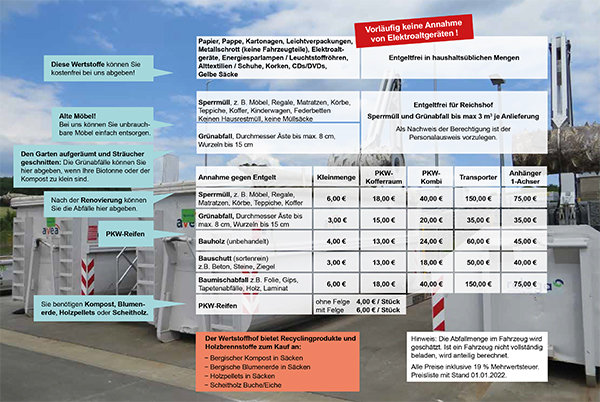 Neben Papier, Pappe, Kartonagen, unbelastetem Bauschutt, Gelben Säcken, Metallschrott, CDs, Sperrmüll, Korken, Energiesparlampen werden auch Gartenabfälle und Reifen angenommen. Elektroaltgeräte sollen später hinzukommen, hierfür fehlt noch die Genehmigung. Das meiste kann in haushaltsüblichen Mengen kostenlos abgegeben werden, der kostenpflichtige Müll wird nicht gewogen, sondern nach Ladung berechnet (siehe Grafik). Bürger aus Reichshof können zudem ihren Sperrmüll und Grünabfall entgeltfrei entsorgen, da dies in den Abfallgebühren der Kommune beinhaltet ist. Zusätzlich bietet der Wertstoffhof Recyclingprodukte (Kompost) und Holzbrennstoffe zum Kauf an.