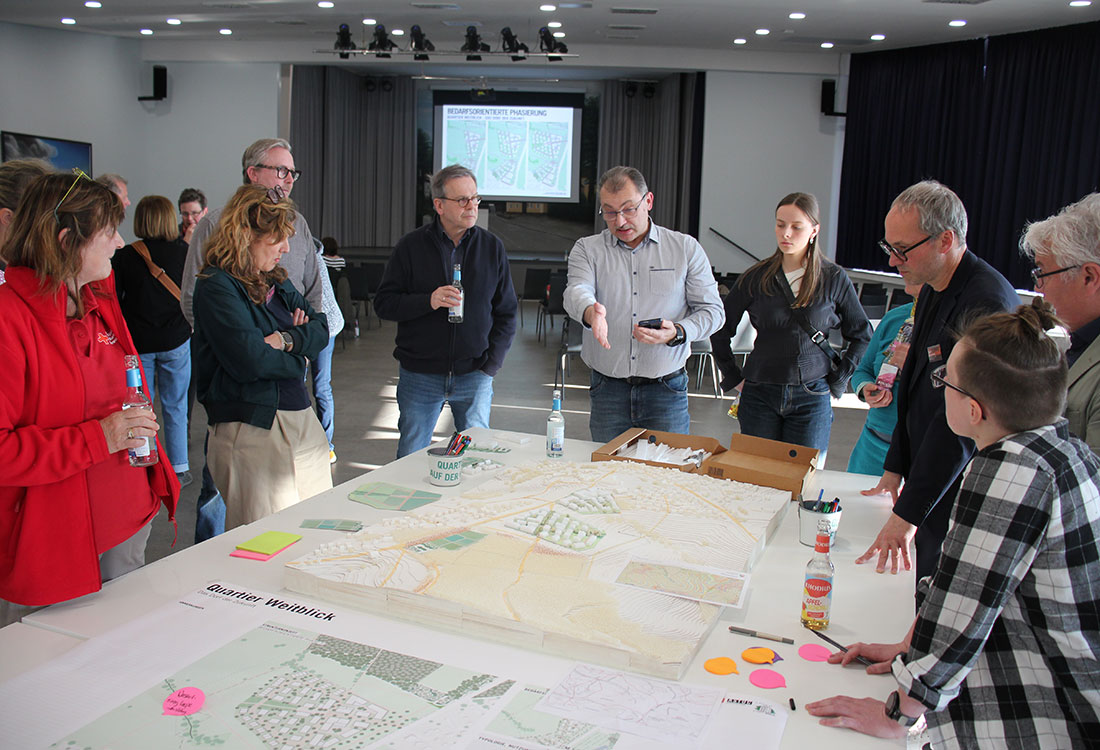 Daniel Luchterhandt vom Hamburger Büro luchterhandt & partner und Peter Berner vom Kölner Architekturbüro Astoc blickten zunächst zurück und stellten die aktuellen Pläne für die drei Bauabschnitte vor, die sich wie schon nach den Werkstätten in den vergangenen Monaten einmal mehr verändert hatten. Am wenigsten getan hatte sich beim Gebiet „Auf der Lichtung“ im Norden, das an Brächen grenzt. Dort soll der bestehende Wald erhalten und zudem aufgeforstet werden, sodass in der Mitte eine Lichtung entsteht. Auf dieser Fläche wäre laut Berner vieles möglich – von Gewerbebauten über eine Mischung aus Wohnen und Arbeiten bis zur Nutzung des Raums für Freizeitanlagen. Er sprach von einer „Jokerfläche“.