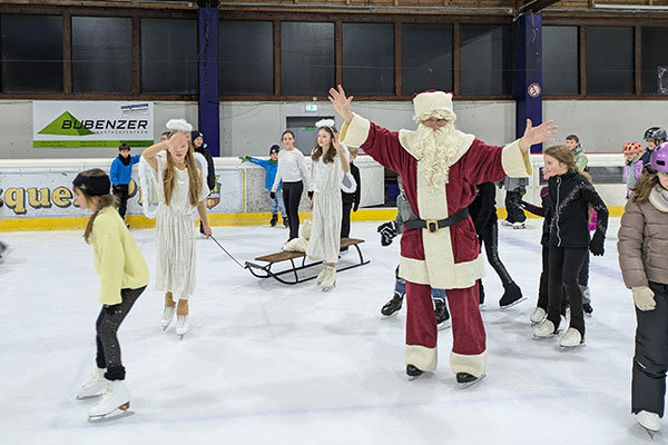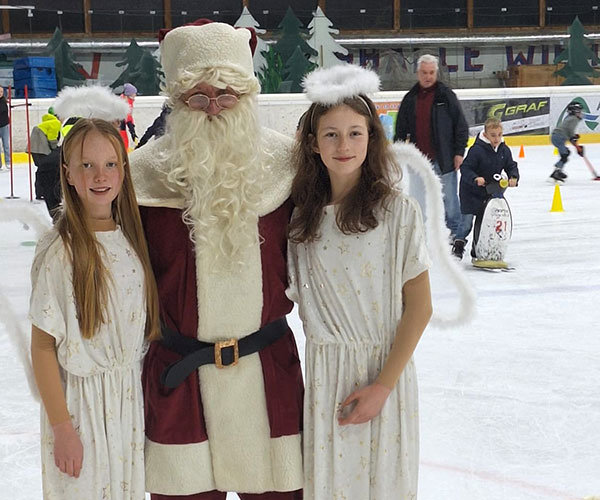 Kurz bevor der Nikolaus am Samstag, 6.Dezember, seine Arbeit aufnimmt, hat er sich am Mittwoch die Zeit genommen und einen Abstecher in die Eissporthalle Wiehl gemacht. Die kleinen und großen Besucher der "Kids Time on Ice" staunten nicht schlecht, als der Nikolaus sich höchstpersönlich mit Schlittschuhen auf das glatte Eis wagte. Gemeinsam mit zwei zauberhaften Engelchen und einem großen Schlitten, drehte er zunächst ein paar Runden und verteilte dann mit seinen fleißigen Engeln die Naschereien, die er in seinem Gepäck dabeihatte. Anschließend hatten dann die begeisterten Kinder und Eltern noch die Gelegenheit Fotos mit dem Nikolaus und seinen Engel zu machen, bevor er sich wieder auf dem Weg machte.