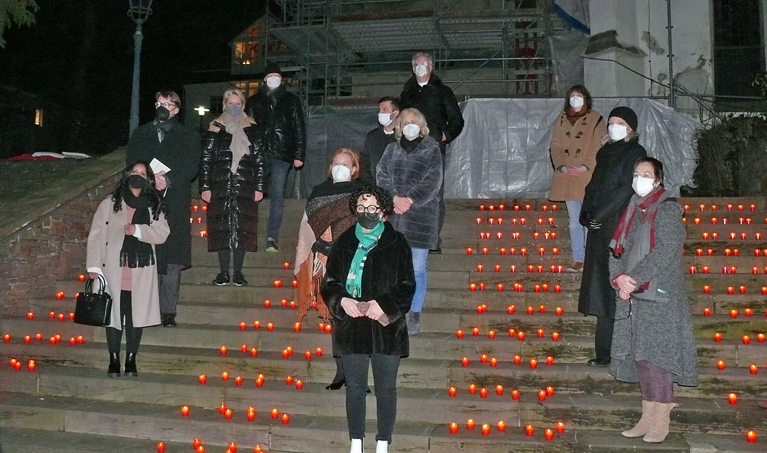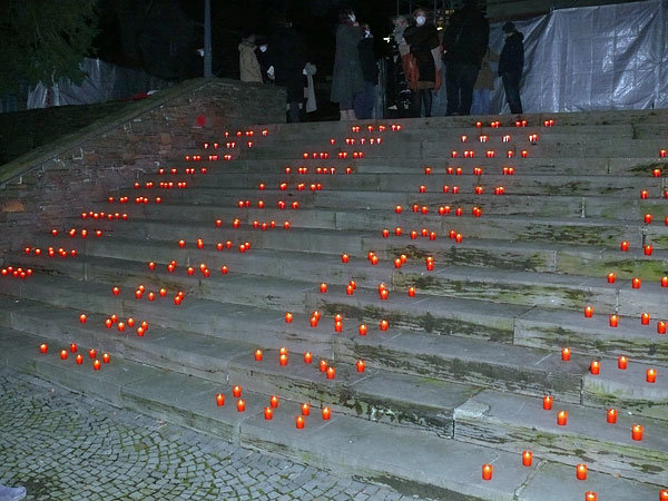 Auf den Stufen der Gummersbacher Altstadtkirche rückten 348 leuchtende Grabkerzen die Verstorbenen ins Bewusstsein und erwiesen ihnen die letzte Ehre. "Bei aller Verschiedenheit der Religionen weist uns allen der Glaube den Weg und erinnert uns daran, der Verstorbenen zu gedenken und die Hinterbliebenen zu trösten", mahnte Michael Braun, Superintendent des evangelischen Kirchenkreises an der Agger. Für den Freundeskreis Mateh Yehuda/Nümbrecht verlas deren Vorsitzende Marion Reinecke den Trostpsalm 23. "Möge ihre Erinnerung ein Segen sein", bekräftigte die Generalsekretärin der Deutsch-israelischen Gesellschaft, Michaela Engelmeier.