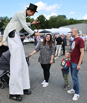 [Als riesengroßer Walking-Act erntete Unterhaltungskünstler Tobia Grün staunende Blicke, nicht nur von den Kindern.]