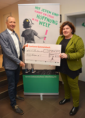 Die gemeinnützige Service GmbH WRS aus Gummersbach hat nun 1.500 Euro an Sandra Karsten übergeben. Die Firma beschäftigt als Inklusionsbetrieb auch Mitarbeiter, die an einer psychischen Erkrankung leiden. Um die Projekte von Lebensfarben zu unterstützen, verzichtet WRS schon seit Jahren auf Weihnachtspräsente für Geschäftspartner.