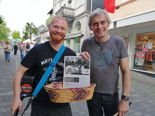 [Für Musik sorgen Jens Winkels (li.) und Küster Jörg Groneberg. Die beiden sammeln dabei Spenden für Menschen in der Ukraine.]